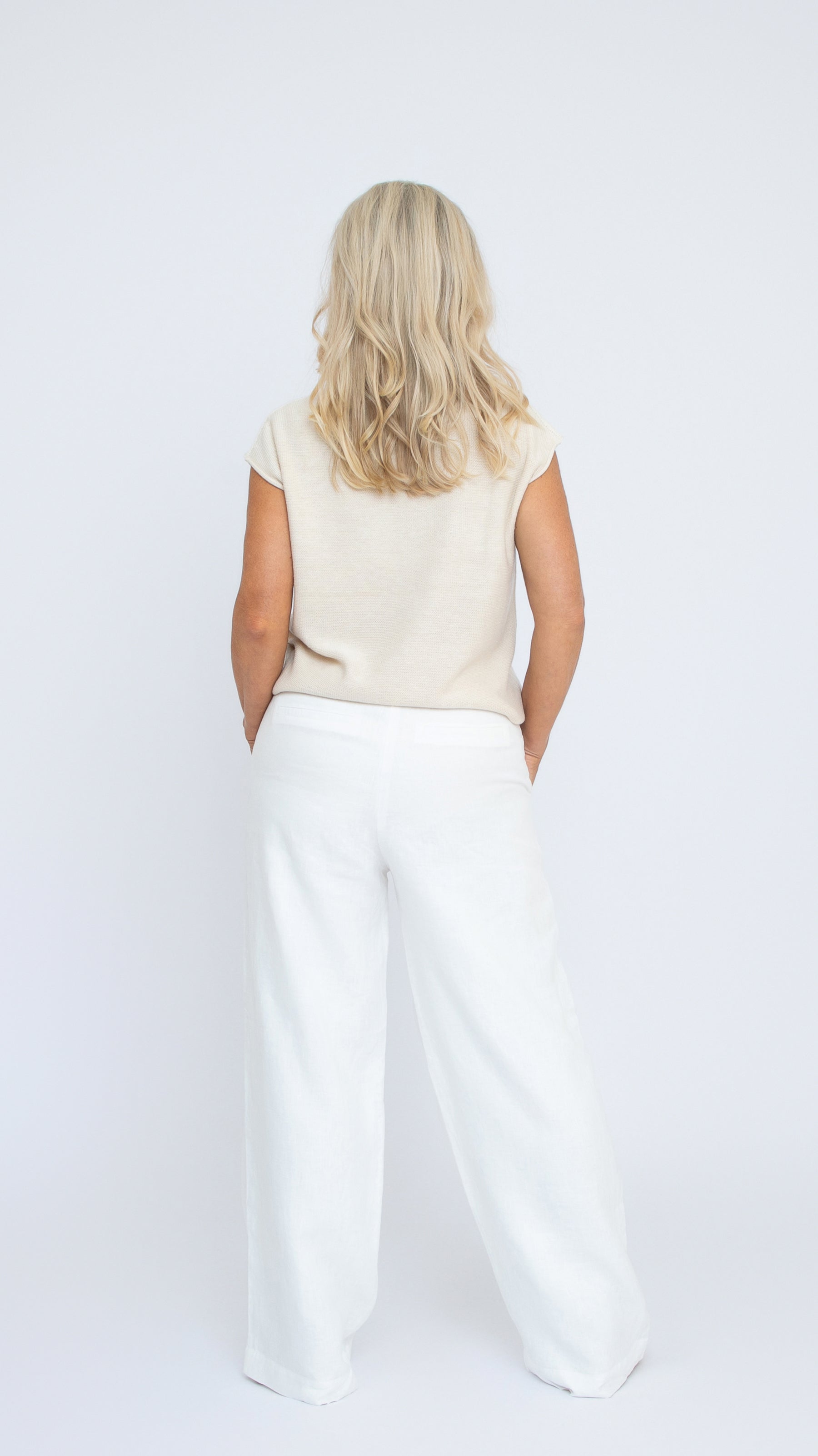 Alex is 161cm tall with a 91cm bust and 77cm waist and wears a size 10. She is wearing the Jules top with the white Paula pants and also her favourite jeans.