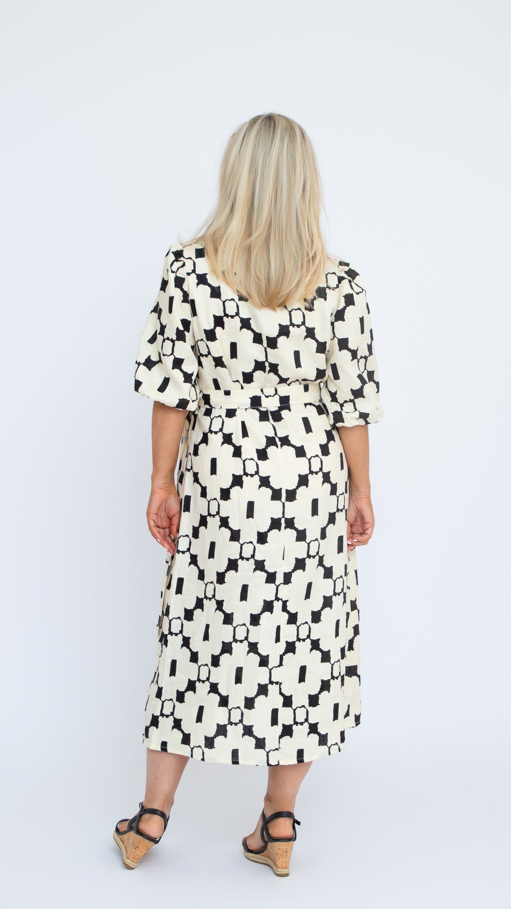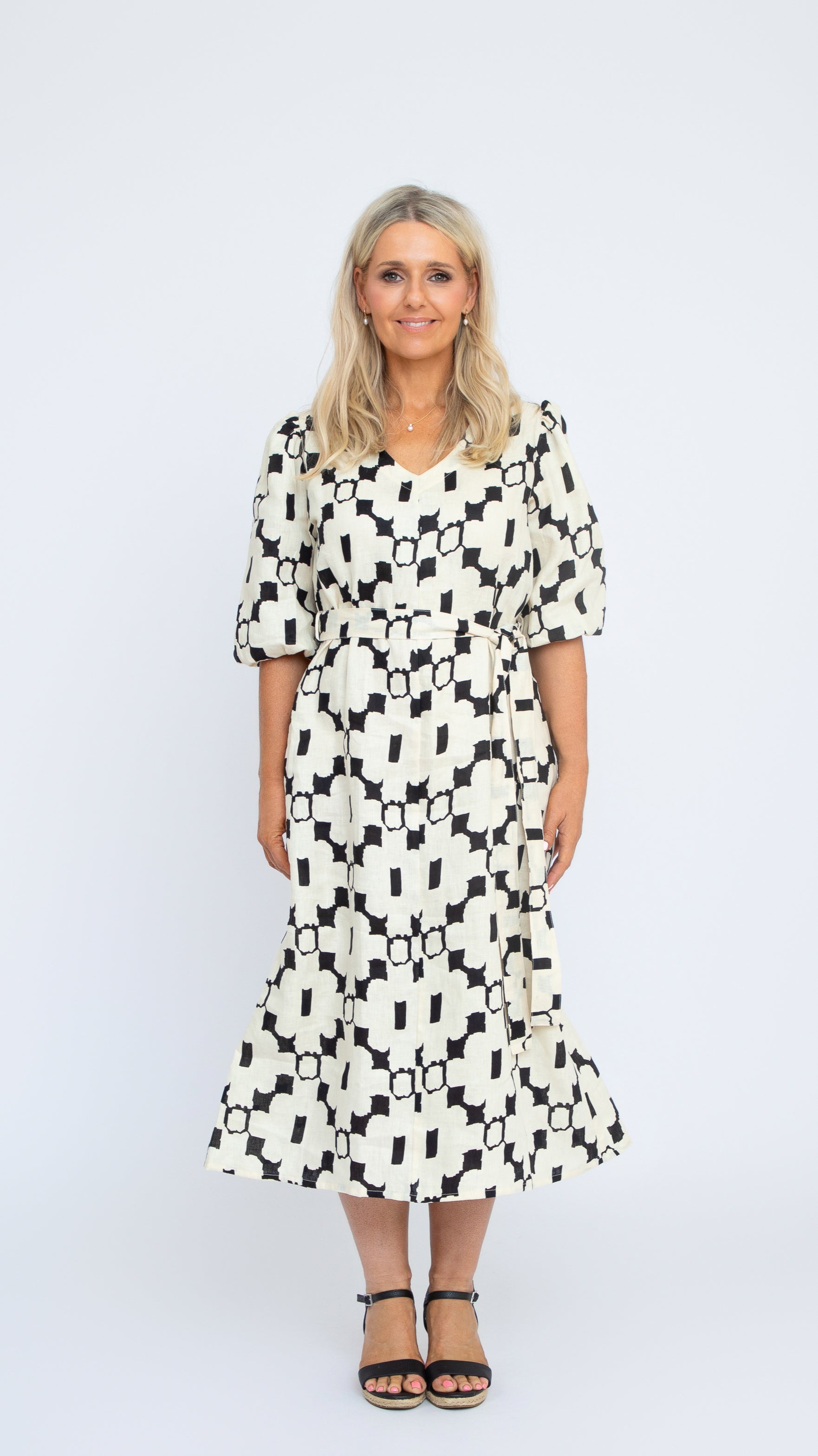 The Linda Dress brings modern ease to everyday elegance. Crafted from 100% linen in the striking Orion Stamp print, it blends effortless comfort with elevated style. The softly gathered waist offers a flattering shape, while the V-neckline and puff sleeves add a feminine, relaxed silhouette. Whether you’re heading to lunch by the water or hosting friends at home, the Linda Dress makes everyday dressing feel beautifully effortless
